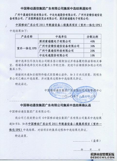 UPS大型制造商及UPS专业解决方案专家——乐鱼体育,以绝对的厂商实力、专业快捷的售后服务在中国移动广东公司2011年集采入围项目中以最大份额中标。
