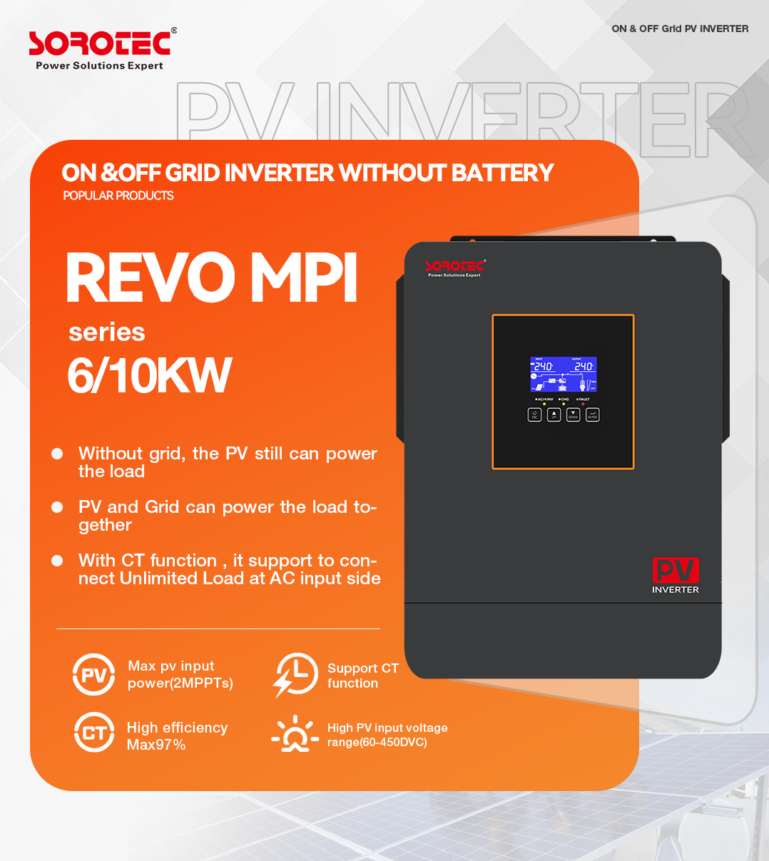 【超强适配】MPPT电压范围60-450VDC,兼容高功率组件,转换效率峰值97%。